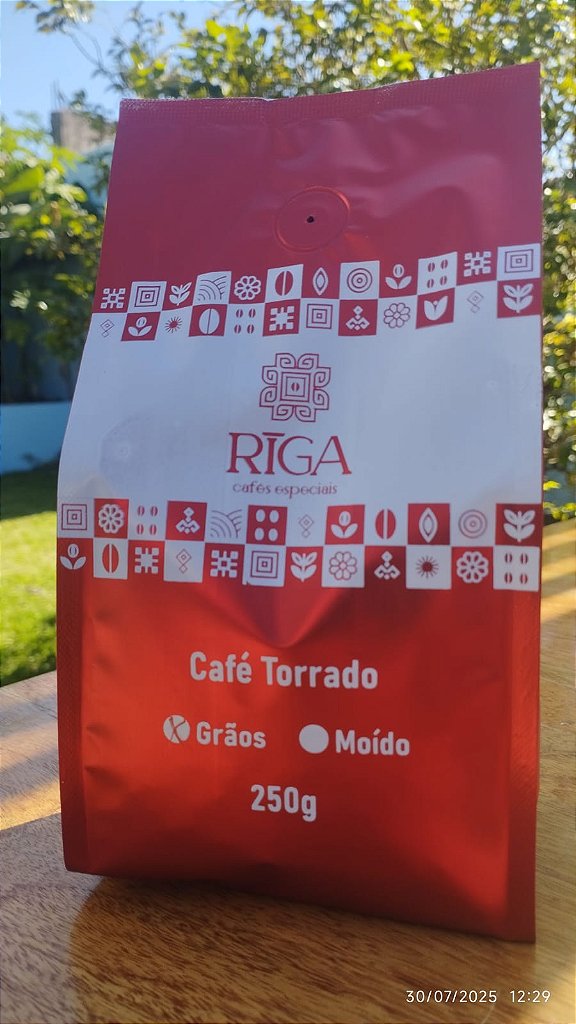 Café Rīga Chocolate e caramelo - Café com notas de chocolate, caramelo e amêndoas. Acidez leve e suave, com torra média intensa, que entrega uma bebida doce, encorpada, clássica, ideal para o dia a dia. Versátil, tanto para o espresso ou coado e o mundo coorporativo. Destaca-se no preparo em coador de papel ou pano, bem como em máquinas de café espresso e cafeteira italiana (Moka).